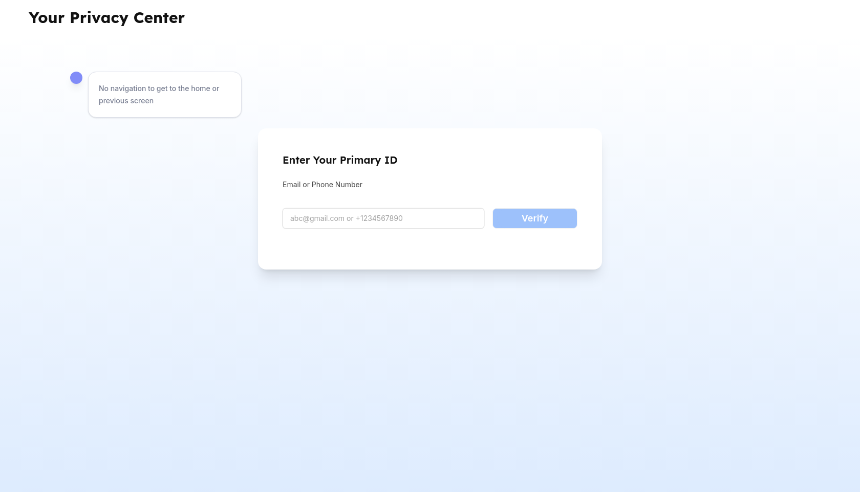 A lot of places the screen does not have a navigation option to go back. Like in the attached screenshot. Also, faced the same issue in certain attempts on the Trust Centre too. This could be erroneous in case where the session/form submission resets on hitting the back button on the browser